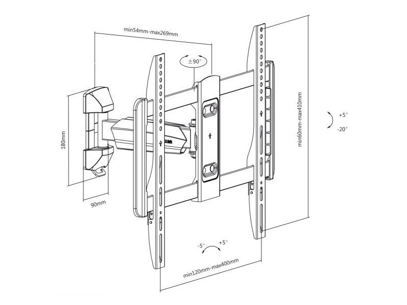 Uchwyt TV z serii LC-U9R1 55 umożliwia regulację kąta obrotu (+/-90 stopni), pochylenia (od -20 do +5 stopni) oraz odległości ekranu od ściany (54 - 269 mm). Dzięki dużej swobodzie w regulacji położenia ekranu telewizora możemy go odpowiednio dopasować zarówno do kierunku, wysokości, jak i odległości wzroku widza (najwyższy komfort oglądania filmów i telewizji).